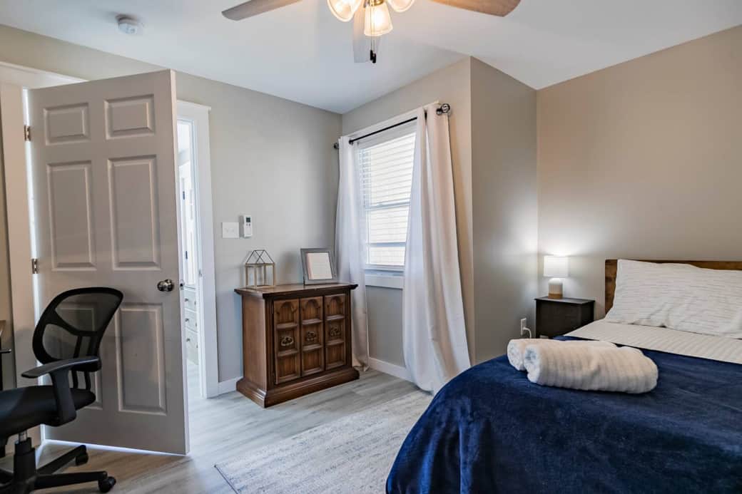 Blackout curtains, ceiling fan, ice-cold mini-split AC, and a dedicated work station with high-speed Xfinity internet
