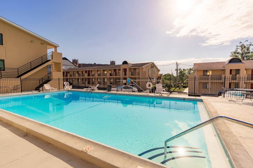 Gated swimming pool with lounge chairs and seating, first come, first serve